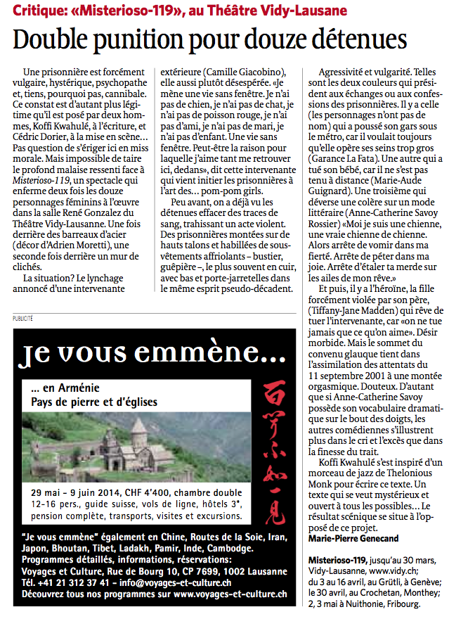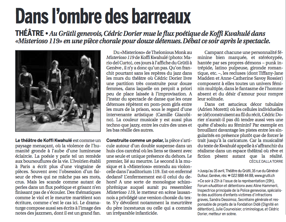 Inspirée du célèbre morceau de jazz signé Thelonious Monk, "Misterioso 119" de Koffi Kwahulé est une énigme théâtrale. L'auteur nous offre une partition composée de 16 tableaux et d'un nombre d'interprètes féminines à déterminer. Que raconte-t-il ? Qui raconte quoi ? Dans quels méandres de la psyché humaine l'auteur veut-il nous conduire ? Cédric Dorier s'est immergé dans cet univers qui est aussi un condensé d'humanité, tentant de percer les ressorts secrets de l'écriture et de construire sa propre orchestration. Douze femmes incarcérées doivent créer un spectacle de danse. Se tisse alors, sur un mode alternativement drolatique et dramatique, un réseau inextricable de complexes, de fantasmes et de frustrations. Une passionnante aventure s'amorce...